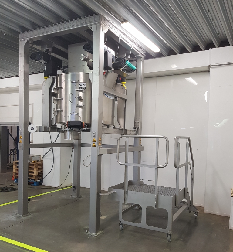 Voor een machinebouwer in de voeding ontwierpen en bouwden we een structuur met trap ter ondersteuning van een menginstallatie.
